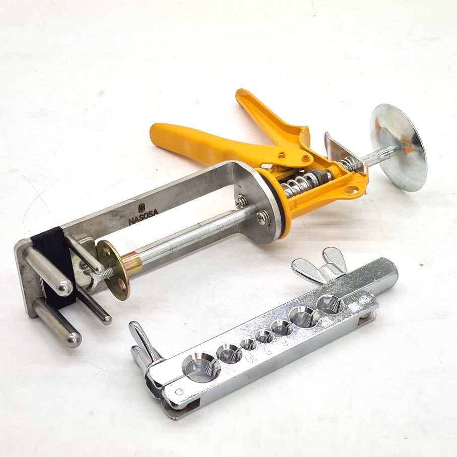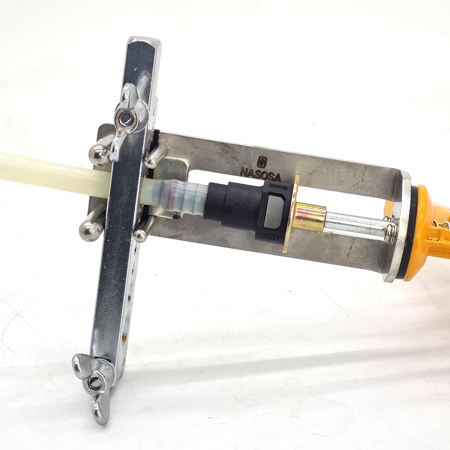 NSI-009 Пистолет для напрессовки быстросъемов на полиамидную трубку новой модификации. Отличается от NSI-002 и NSI-008 в этой версии была изменена конструкция направляющей и набор зажимов трубок был заменён на металлическую струбцину. В отличие от NSI-002 и NSI-008 не очень удобно использовать для ремонта и замены быстросъемов топливных магистралей на автомобиле, но проще работать с трубками, толщина стенок которых превышает 1мм.