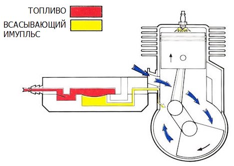 Вакуумные топливные насосы работают за счет разницы давления в картере двигателя. По мере того, как поршень перемещается вверх и вниз, давление в корпусе кривошипа положительное или отрицательное. Как вы видите, эта разница в давлении и заставляет мебрану насоса двигаться, а обратный клапан закрываться или открываться, качая топливо через множество небольших каналов.